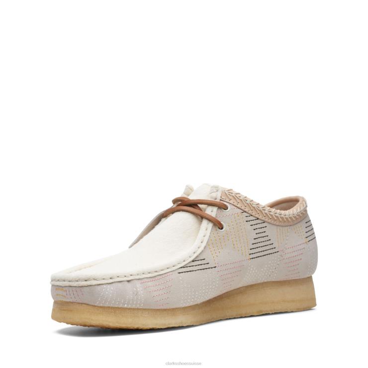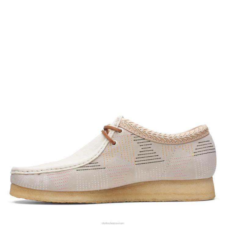 Le daim brodé d’inspiration sashiko et une finition tactile en poils de poney sur l’empeigne confèrent une touche estivale à la silhouette structurelle emblématique du wallabee. les coutures à la main en forme de chaîne sur le col en cuir beige végétal ajoutent une finition artisanale